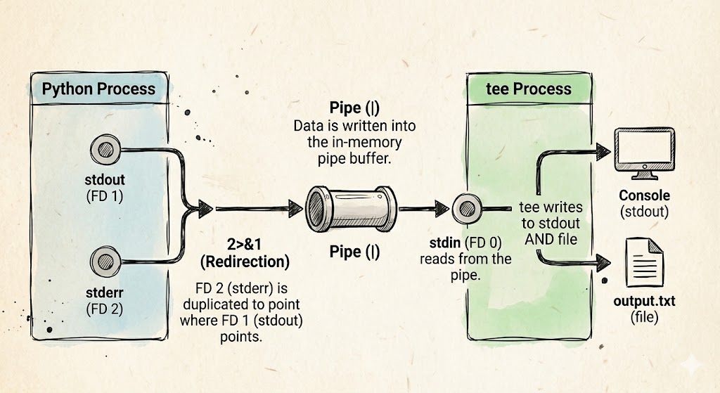 A classic gotcha when learning to handle logs is discovering that output.txt is incomplete. This happens because, by default, the pipe (|) only connects stdout (FD 1).